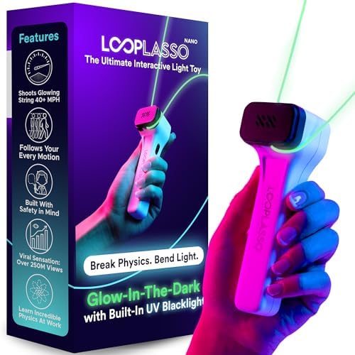 🚀 The Ultimate Interactive Light Toy – The Loop Lasso combines physics and technology to shoot a glowing string at over 40+ mph to create a mind-blowing levitating effect. Move your hand and watch it as it follows your every motion through the air to create colorful, illuminated shapes.