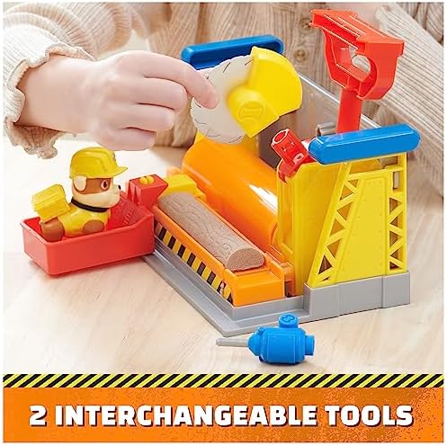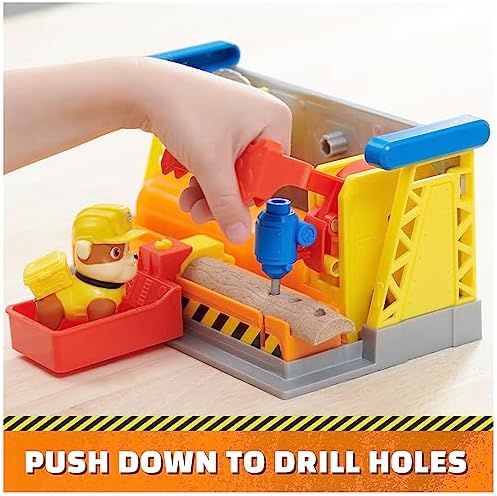 Team up with your favorite PAW Patrol Pup, Rubble, and create exciting construction play, with the Bark Yard Workshop Playset! Featuring exciting construction toys and toy tools, like a toy drill and a movable miter saw, as well as 3 oz of Kinetic Build-It sand, which is are fascinating sensory toys for kids that you can use to create molded logs and building blocks to build with, and then drill holes in them and chop them up with the kids tools, to create even more innovative building projects! This amazing playset also includes a Rubble toy figure that stands over 2-inchces tall, so kids and their parents can pretend to team up with Rubble to relive their favorite scenes from the show and create cute projects of their own! For even more exciting ways to play, look for all the Rubble & Crew construction truck toys and toy figures and playsets with Kinetic Build-It sand, along with the Bark Yard Crane Tower Playset to build out your pretend play construction world even more (each sold separately)! Bring the excitement of the Rubble & Crew series to life with Rubble’s Workshop Playset!