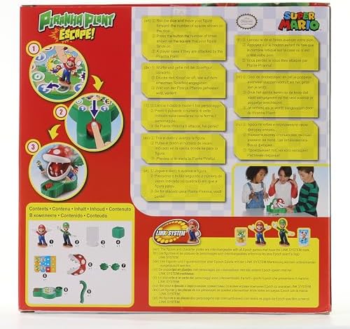 High quality games from Epoch and iconic Super Mario Action Figures come together in the newest line of tabletop action games from Epoch Games. Piranha Plant Escape! includes easy-to-assemble Piranha Plant game board with 2 unique Super Mario Action Figures and die. Game play starts when one player rolls the die to determine how many spaces for their Super Mario character to move along the game board. The number you land on determines how many chances you must take against the hungry Piranha Plant! Epoch Games Link System allows Super Mario Action Figures from Piranha Plant to play across the range of games including Balancing Games, Blow up! Shaky Tower and more! Epoch Games are suitable for girls and boys ages 4 and above. Not suitable for children under age 3 due to small parts.
