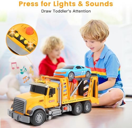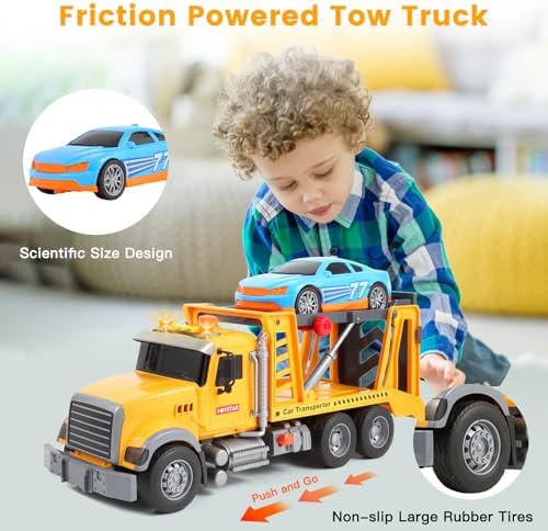 【Push and Go Boy Toys】The friction-powered push & go feature means this large tow truck travels far distances, accompanied by authentic lights and sounds, delivering an extra layer of excitement to imaginative play. The tow truck toy has anti slip large rubber tires, so they grip the floor nicely as they roll along.